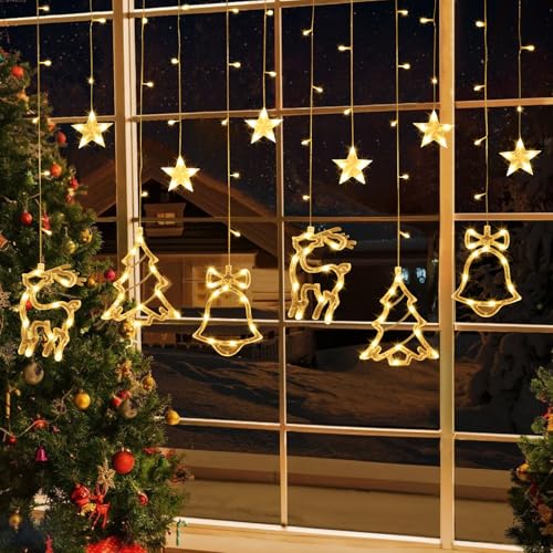 – ⭐【138 LEDs Lichterkette Weihnachten】:Die 3.5 x 1m große Weihnachtesbeleuchtung mit 138 hellen LEDs, insgesamt 12 Tropfen und 4 verschiedenen Designs: Sterne, Elche, Weihnachtsbäume und Glocken. Der Abstand zwischen jedem Tropfen beträgt 20cm, 1.5m Zuleitung mit EU-Standard -Stecker, 3.5 W energieeffizient, mit transparentem Kabel.